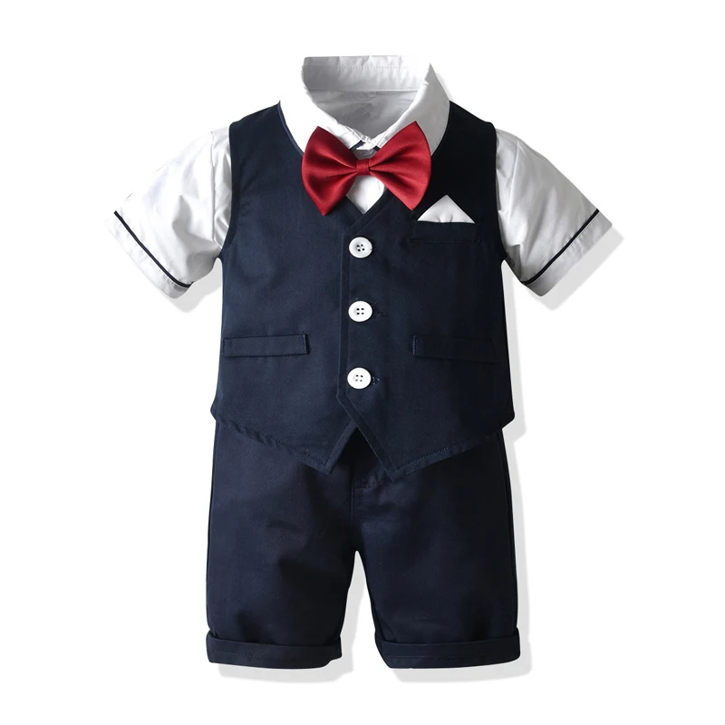 Комплекты джентльменской одежды для маленьких мальчиков Детский модный костюм От 1 до 6 лет Одежда для мальчиков с красным галстуком-бабочкой жилет + рубашка + шорты праздничный костюм из 3 предметов