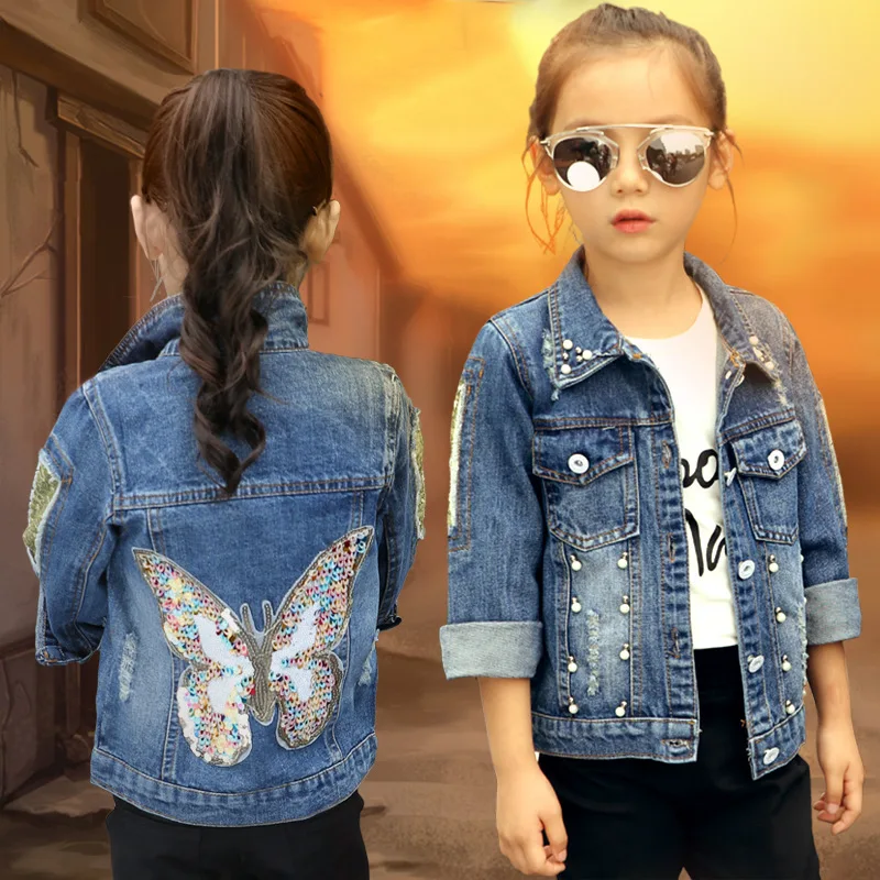 2019 джинсовый комбинезон для девочек-подростков, куртка, кардиган, пальто, детская джинсовая куртка с бабочками Вышивка блесток детская одеж...