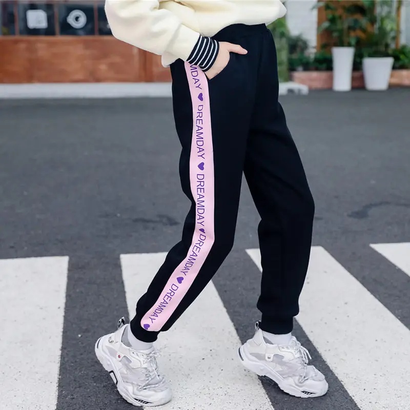 Спортивные штаны; Одежда для девочек 8, 10, 12 лет; Детские брюки; Цвет розовый; В полоску; Сезон осень-зима; Повседневные свободные детские спортивные штаны для школы
