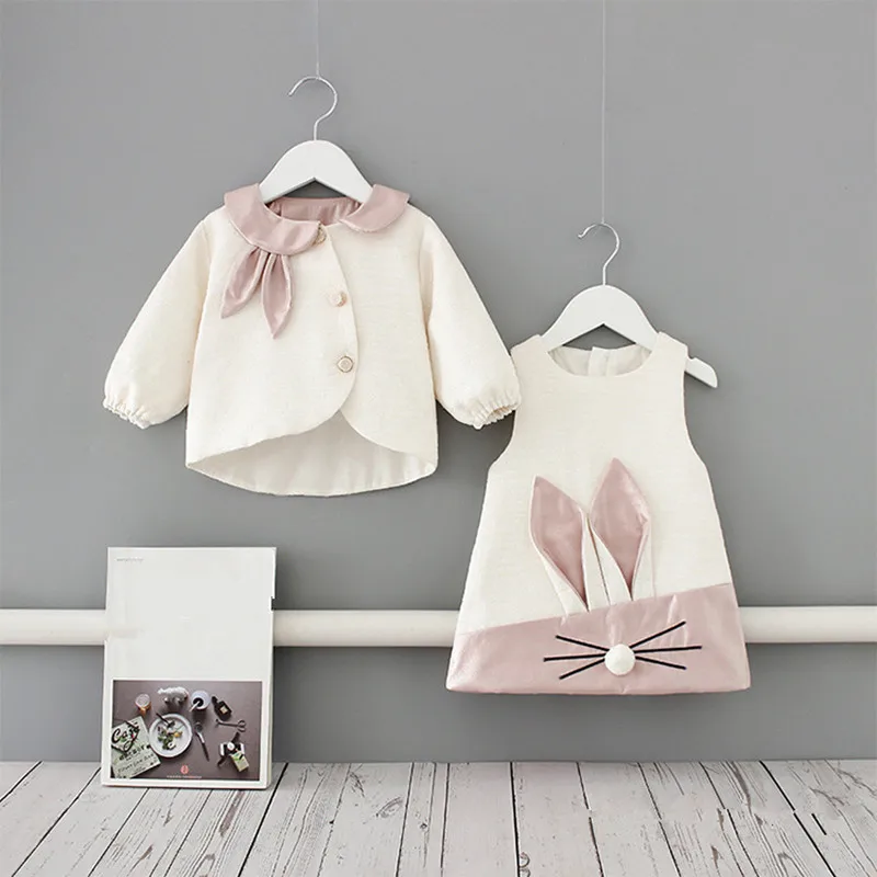 Дети с воротником в стиле «Питер Пэн» Пальто для маленьких девочек + Кролик Детские платья хлопковая одежда 2 шт./компл. 2020 новейшая модель; комплект модной одежды; костюмы для детей