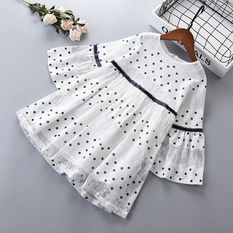 От 3 до 10 лет высококачественное платье для девочек 2019 Весна Новая мода Повседневная точка кружево, широкие рукава ребенок дети девочка одеж...