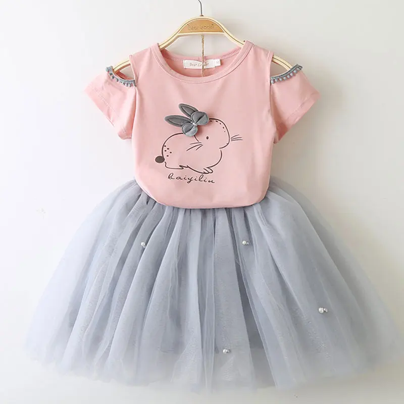 Новинка 2019 года, комплекты летней одежды для маленьких девочек, Модная стильная футболка с рисунком котенка + Сетчатое платье с вуалью, 2 пре...