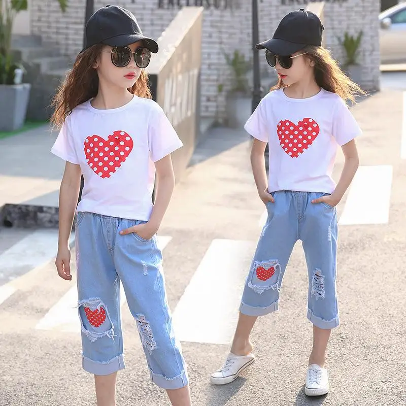 Комплект одежды для девочек, летняя одежда для девочек, короткий рукав, принт с сердцем + рваные джинсовые шорты Детская одежда размеры для д...