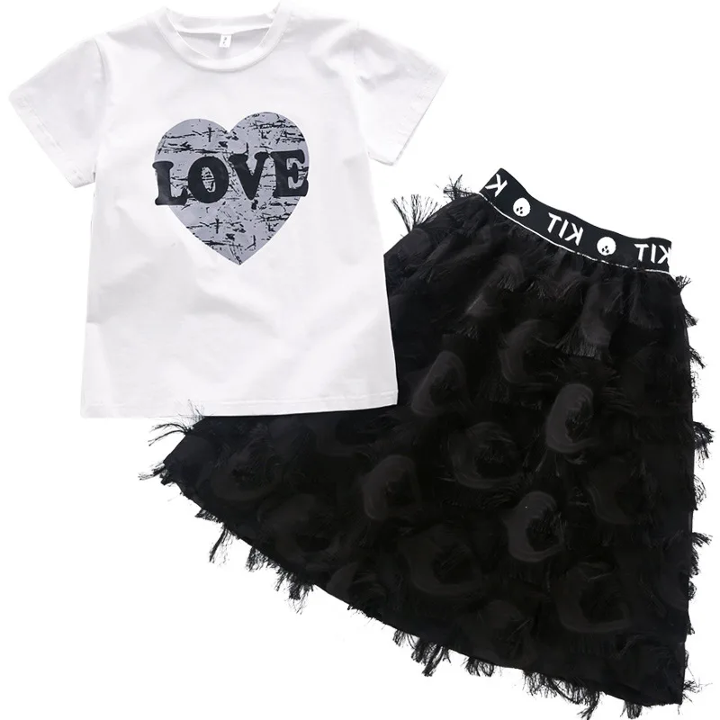 Летний комплект для девочек, комплекты детской одежды комплект одежды из 2 предметов для девочек-подростков белая футболка с принтом сердца + юбка для детей 6, 8, 10, 12 лет