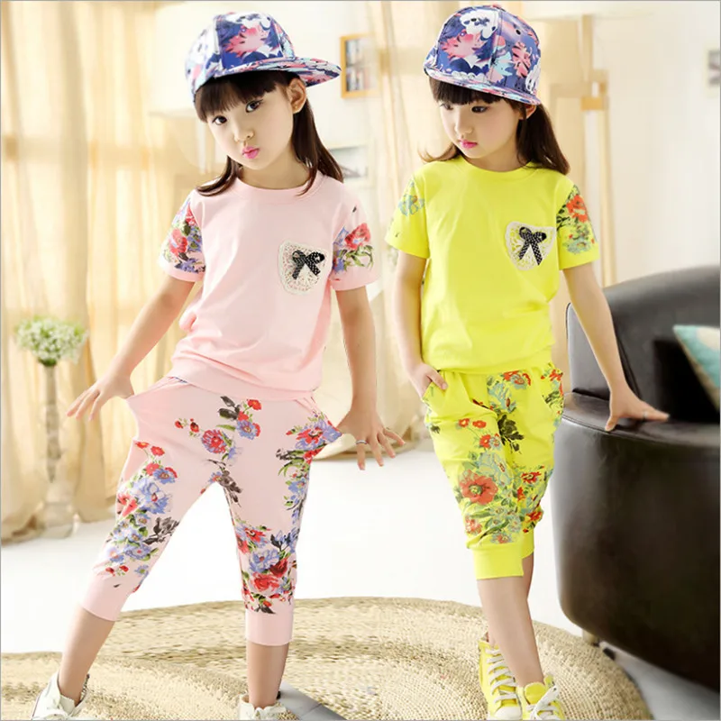 2018 г. летняя одежда комплект Повседневное круглым вырезом короткий рукав пуловер с принтом костюмы Двойка Комплект Детская одежда 110-160