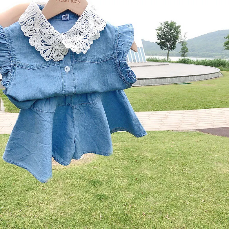 Детский комплект, лето 2020, новая детская рубашка короткая юбка Кружевной Костюм с джинсовой юбкой для девочек из двух предметов, детская одежда