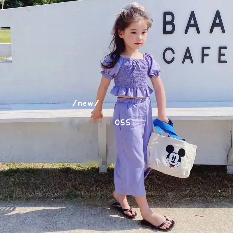 Летний комплект из 2 предметов для девочек, блузка для малышей + широкие штаны Детский костюм комплект детской одежды, плиссированные с рюшами, с открытыми плечами, для детей от 3 до 8 лет