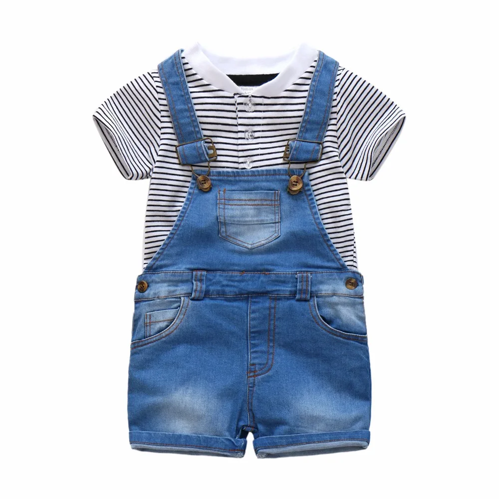 Комплект детской одежды для мальчиков и девочек, футболка в полоску + короткие джинсы, 2 предмета, летняя детская одежда, повседневная одежда...