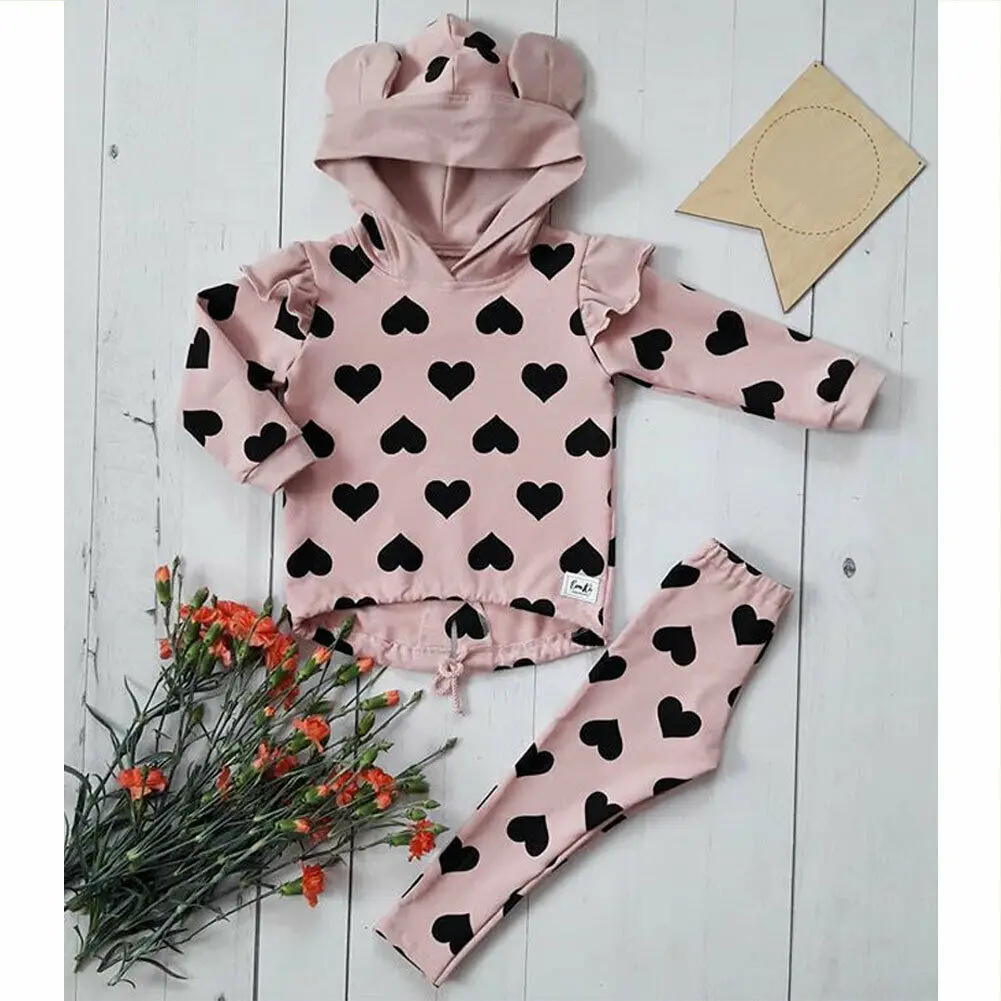 Новые осенние комплекты одежды для маленьких девочек детский топ с принтом, пуловер с капюшоном и ушками + штаны хлопковая одежда От 1 до 5 ле...