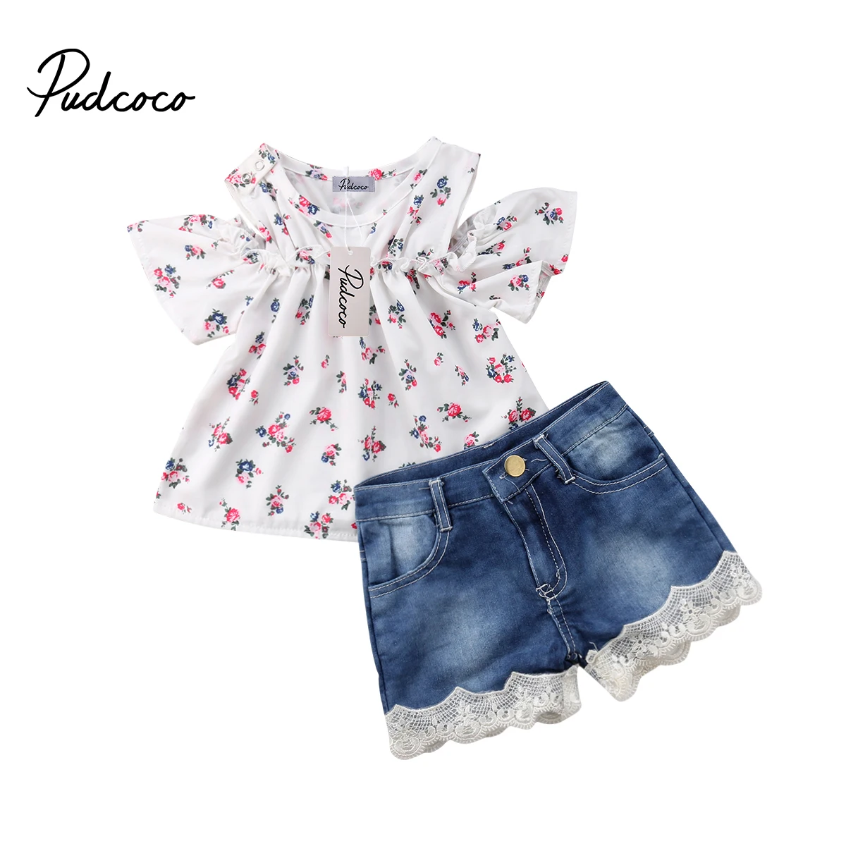 Комплект летней одежды для маленьких девочек; топы с открытыми плечами; футболки с цветочным принтом; джинсовые штаны; Одежда для новорожде...