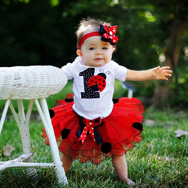 Новорожденных для маленьких девочек 1st Birhday платье наряды Летний Топ Ползунки точек Туту повязка 3 шт. комплекты Детский костюм Одежда для де...