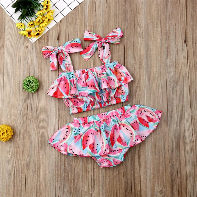 Одежда для маленьких девочек; Бесплатная доставка; пуловер с открытыми плечами и бретельками; топы с оборками; шорты с принтом арбуза; детская одежда из 2 предметов