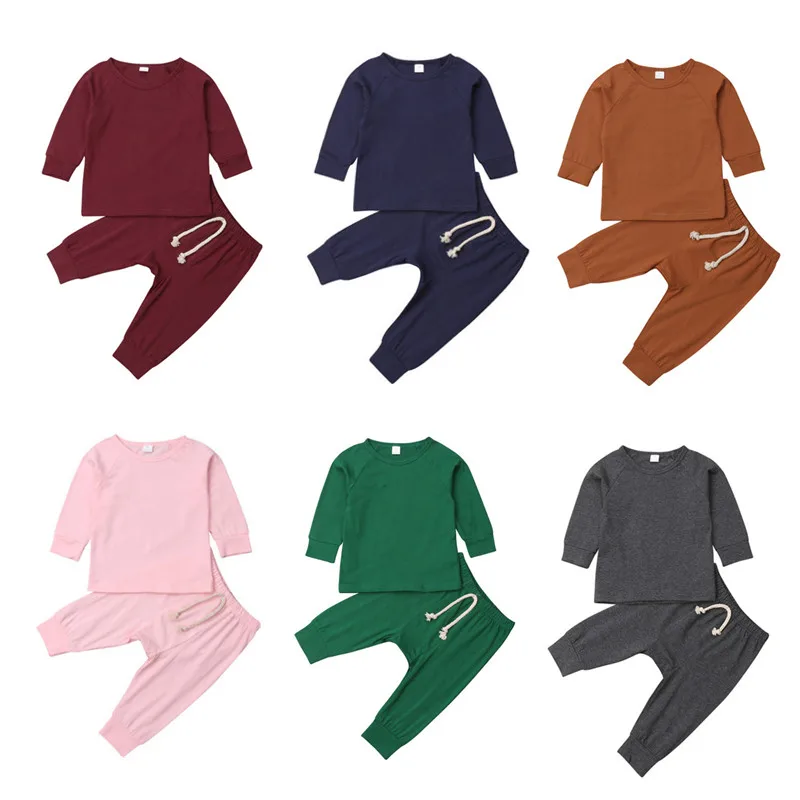 Весенне-осенняя одежда для сна на возраст от 0 до 24 месяцев Новые однотонные топы с длинными рукавами для маленьких мальчиков и девочек, футболка + длинные штаны, комплекты пижам комплект одежды