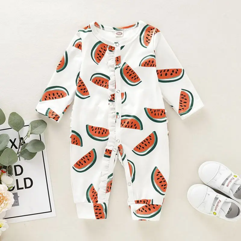 Новая осенняя одежда для маленьких девочек 0-24 месяцев, милый повседневный комбинезон с принтом арбуза для новорожденных, Детский комбинезо...