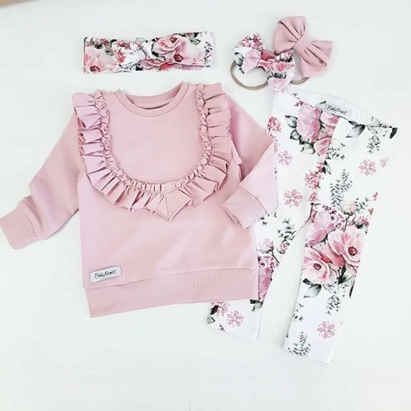 Детская одежда с цветочным принтом для маленьких девочек; топ с длинными рукавами; брюки с оборками