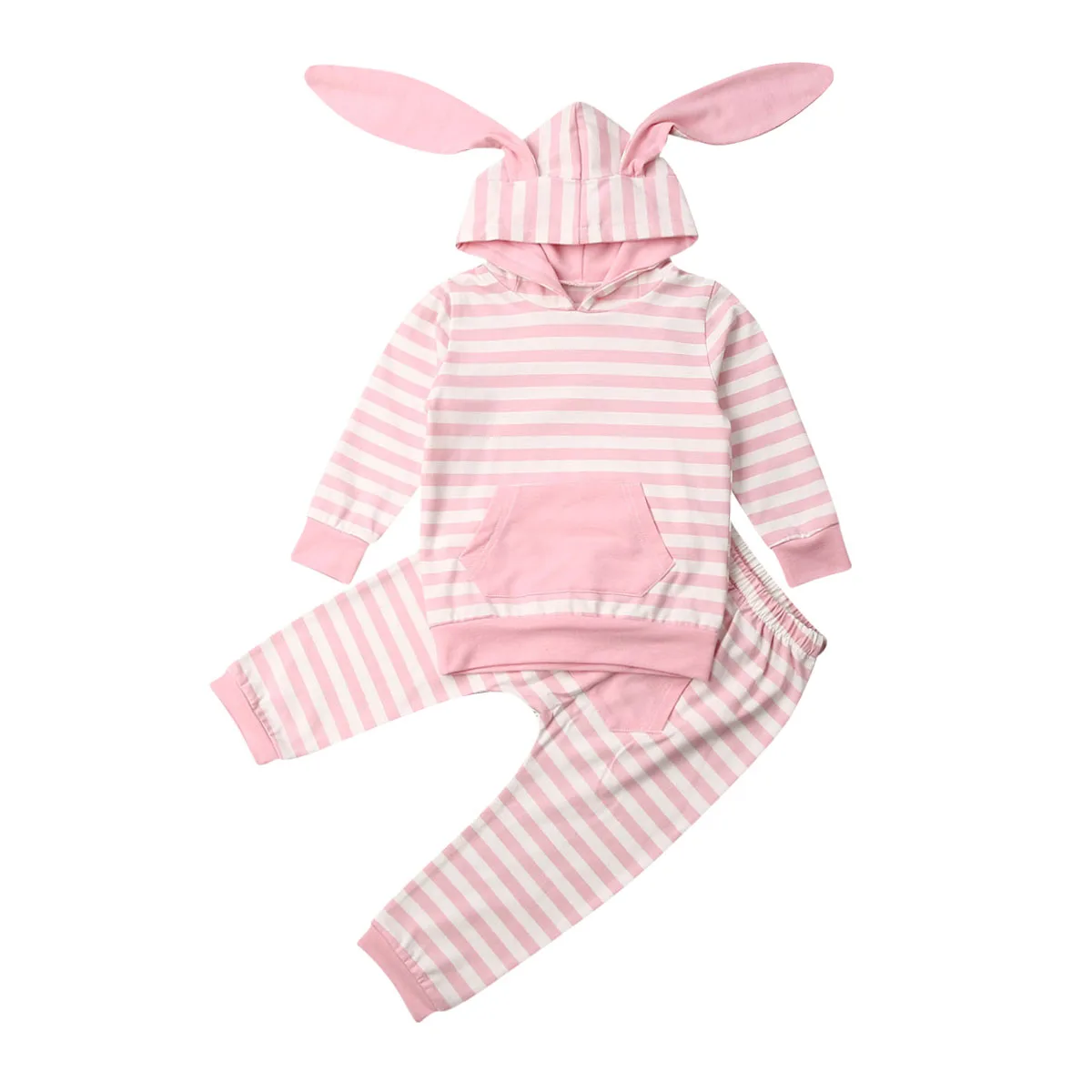 Милые топы с капюшоном с длинными рукавами и заячьими ушками для новорожденных мальчиков и девочек; длинные штаны в полоску; комплект осенн...