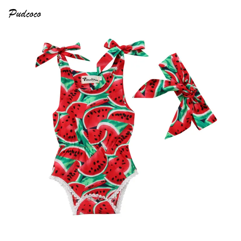 Одежда с арбузами для новорожденных девочек от 3 до 24 месяцев, кружевной Детский комбинезон с повязкой-бантом без рукавов, комплект из 2 предметов, летняя одежда
