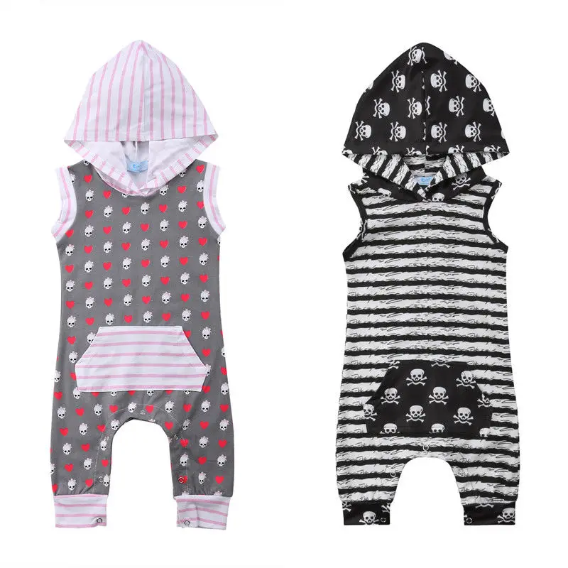 Новорожденный малыш Одежда для маленьких мальчиков и девочек в полоску с капюшоном комбинезон без рукавов с принтом черепа комбинезон
