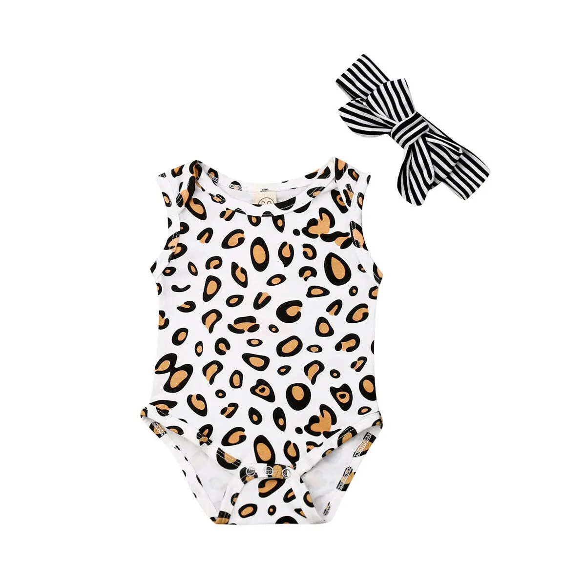 Размер 0-12 мес., комплект для новорожденных, для маленьких мальчиков и девочек платье без рукавов с леопардовым принтом Комбинезон-боди для игр и повязка на голову, комплекты летней одежды из 2 предметов