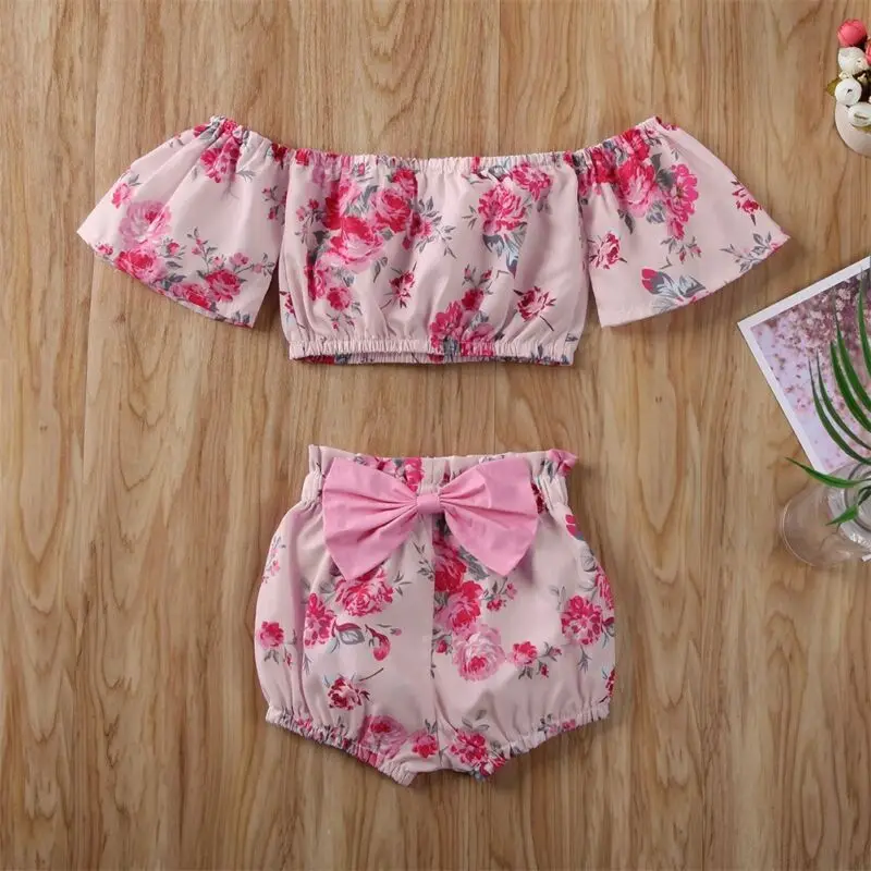 Комплект из 2 предметов для новорожденных девочек; комбинезон с открытыми плечами и цветочным принтом; шорты; штаны; комплект летней одежды для детей 0-24 месяцев