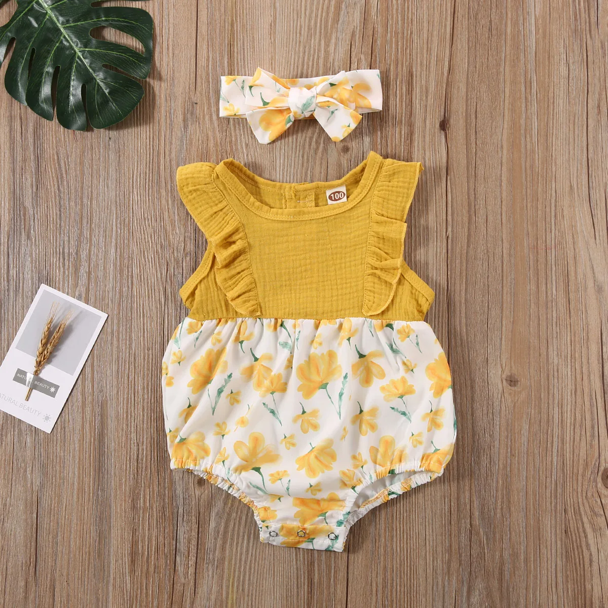 Pudcoco/Одежда для новорожденных девочек; Комбинезон без рукавов с оборками и цветочным принтом; Комбинезон; Повязка на голову; Комплект из 2 предметов; Хлопковый сарафан; Одежда