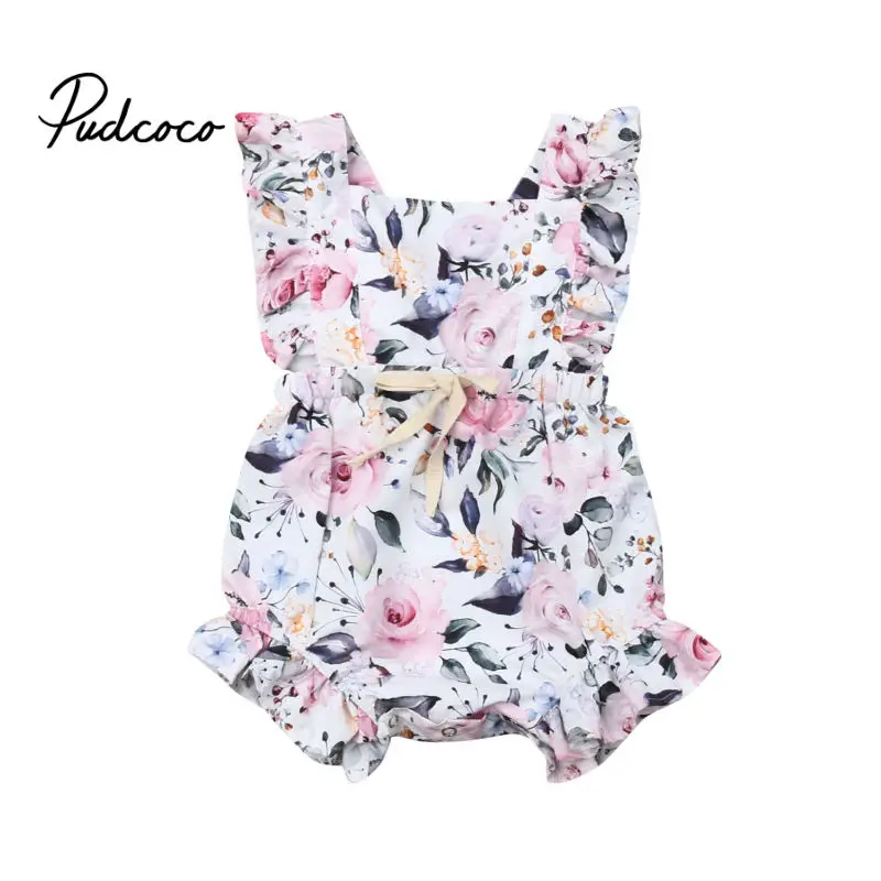 Pudcoco/2019 г.; Модный милый комбинезон для маленьких девочек с цветочным рисунком и рюшами; летний белый комбинезон на шнуровке с бантиком и цве...