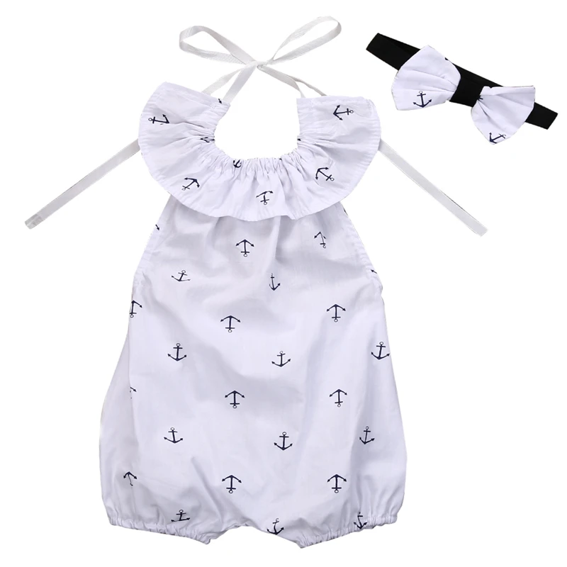 CANIS 2019 Новый Белый для маленьких девочек якорь Ползунки с оборками без рукавов Холтер комбинезон наряды с повязка на голову, пляжный костюм ...