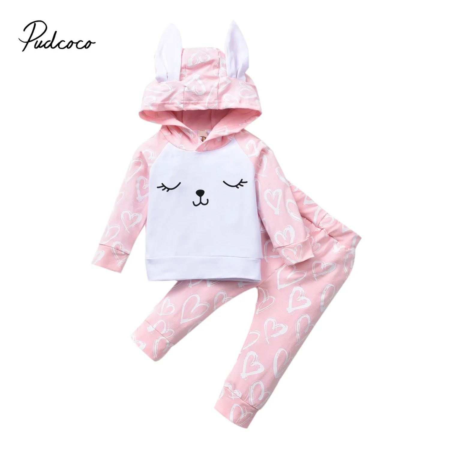 Pudcoco/комплект одежды для новорожденных девочек, топ с капюшоном и объемными заячьими ушками, длинные штаны с принтом сердца костюм на Пасху наряд на День святого Валентина