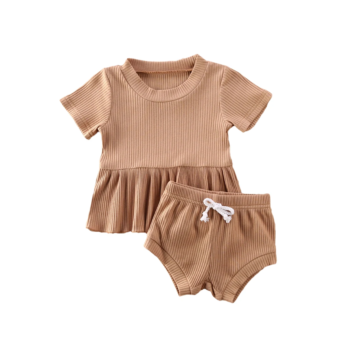 2020 Baby Summer knitted outfit Newborn Baby Girls 2Pcs Set Solid Ribbed Outfits Short Sleeve Shirt Dress Tops Shorts Outfit