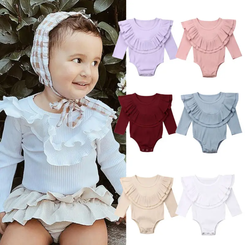 Осенний хлопковый однотонный комбинезон с длинными рукавами и круглым вырезом для новорожденных и маленьких девочек, одежда, костюм