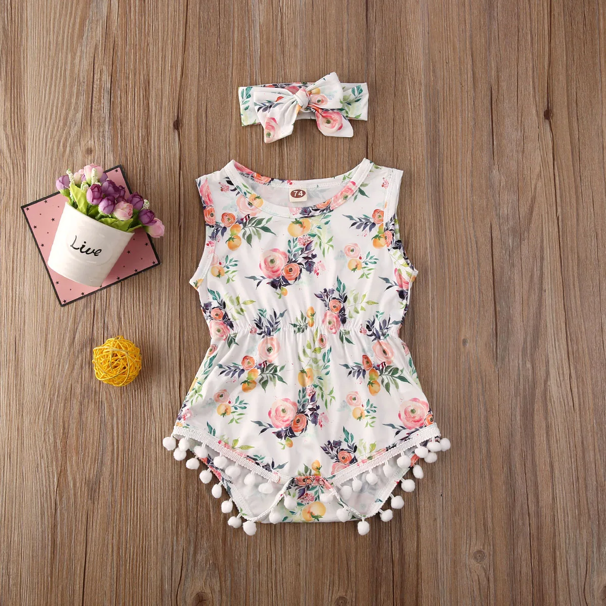 Pudcoco Одежда для новорожденных девочек цветочный принт без рукавов кисточка детский комбинезон повязка на голову 2 шт. наряды комплект хлопковой одежды