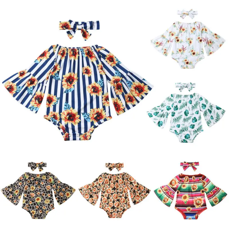 Комбинезон для новорожденных девочек от 0 до 24 месяцев, комбинезон с длинными расклешенными рукавами и принтом подсолнухов, Набор резинок д...
