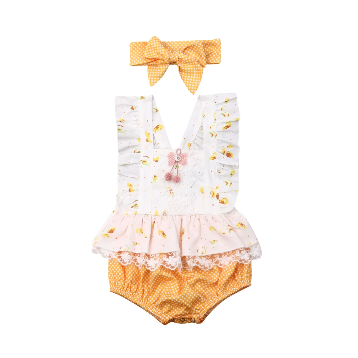Новинка 2019 года, Летние Боди для маленьких девочек от 0 до 24 месяцев повязка на голову, 2 предмета, с оборками, без рукавов, с цветочным принтом...