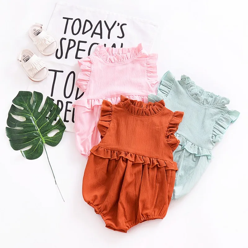 От 0 до 4 лет Одежда для новорожденных для маленьких девочек; летнее однотонное хлопковый Ромпер комбинезон без рукавов, костюмы, летний пляж...