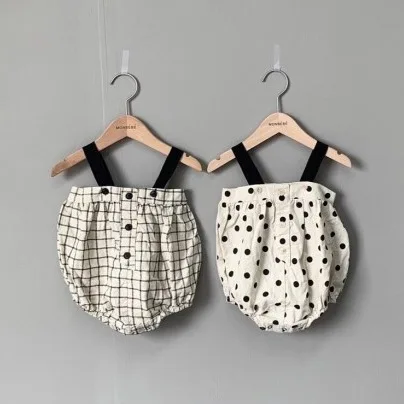 3600 Корейский детский хлопковый комбинезон на бретельках без рукавов, милый комбинезон в горошек с высокой талией и поясом, 2020 летний клетчатый комбинезон для маленьких девочек