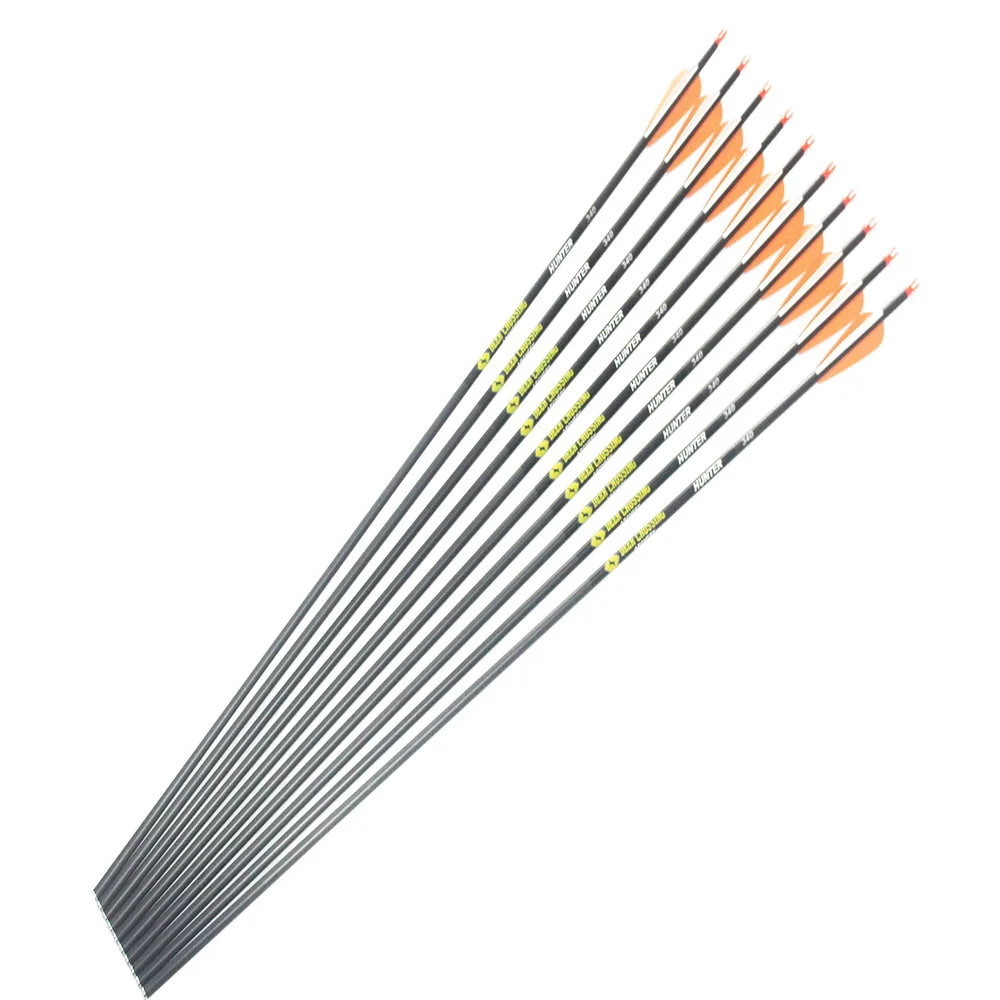 12 шт. высокое качество чистого углеродного стрелка позвоночника 340 с 3 "пластиковые лопасти и Bohning НОК для блочного Лука Охота