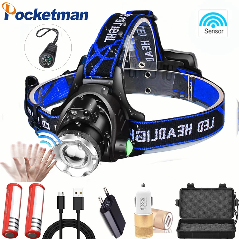 USB светодио дный фары XM-L L2 XML-T6 5000LM фар движения Сенсор Фары головного лампы факел фонарик Открытый Фонари на голове