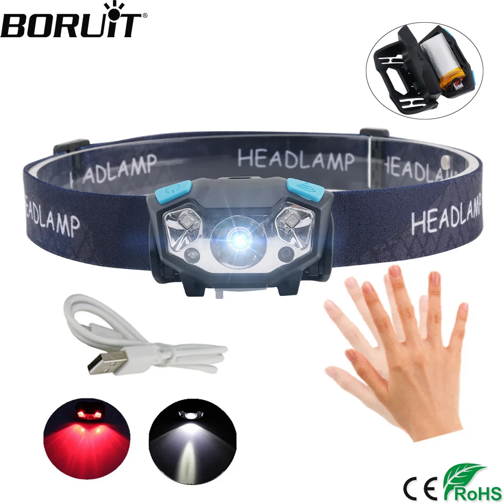 BORUiT USB зарядка Индукционная фара XPE движения Сенсор налобный фонарь 5-режим Охота фонарик походный налобный фонарь встроенный Батарея