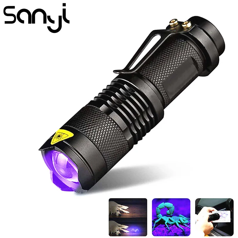Портативный УФ-фонарик SANYI SK68, алюминиевый мини-фонарик фиолетового и фиолетового цвета, нм, регулируемый фокус, 3 режима освещения