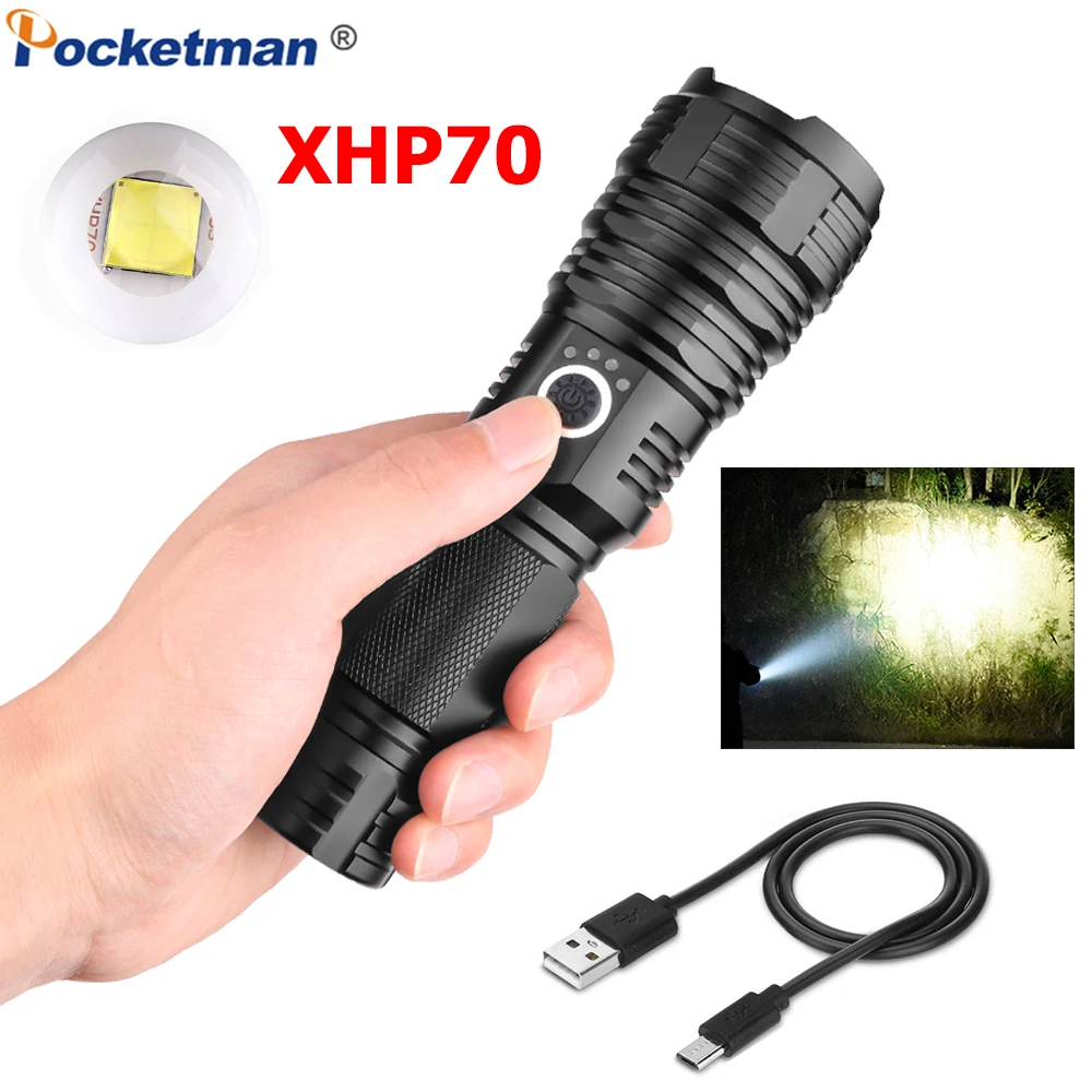 Супер мощный светодиодный фонарь XHP70, перезаряжаемый через USB, фонарь с зумом, 5 режимов, водонепроницаемый фонарь, аккумулятор 18650 26650