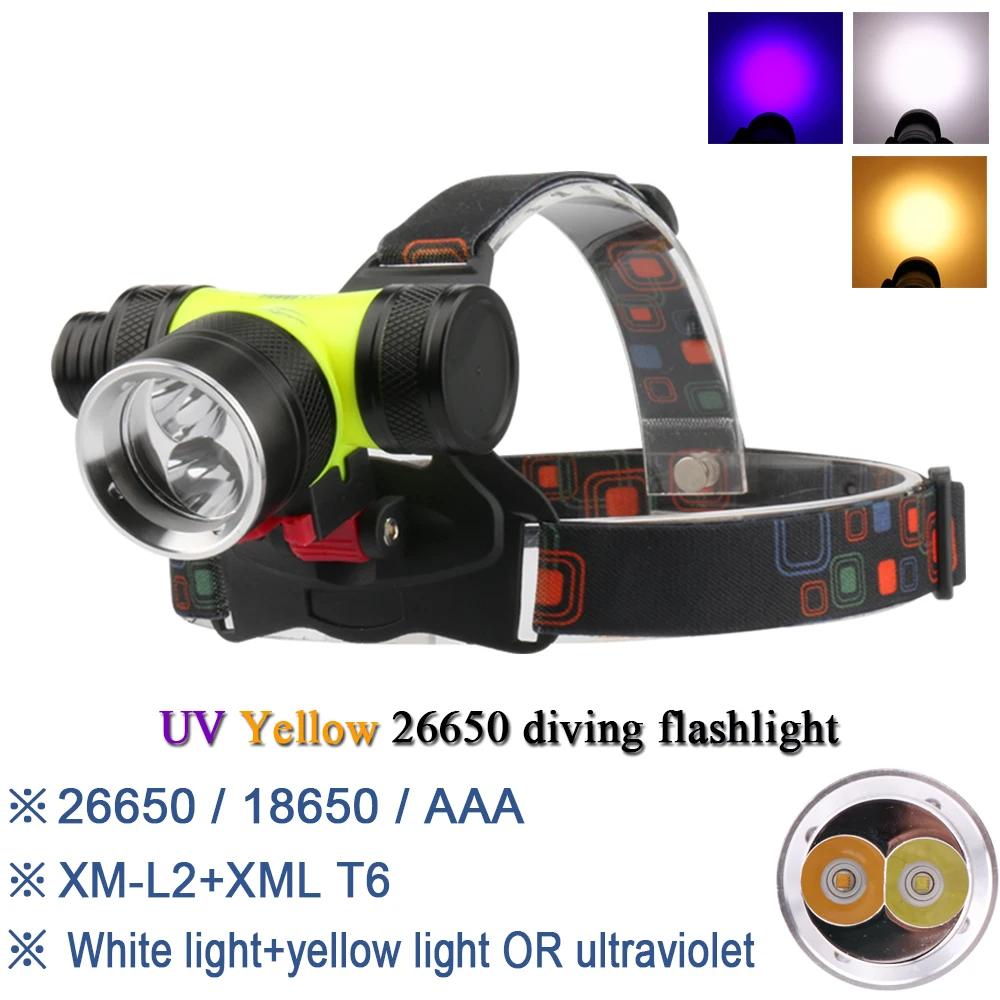 Желтый белый свет Водонепроницаемая светодиодная фара Дайвинг головного фонарь, налобный фонарь двойной источник света cree xml t6 l2 налобный ф...