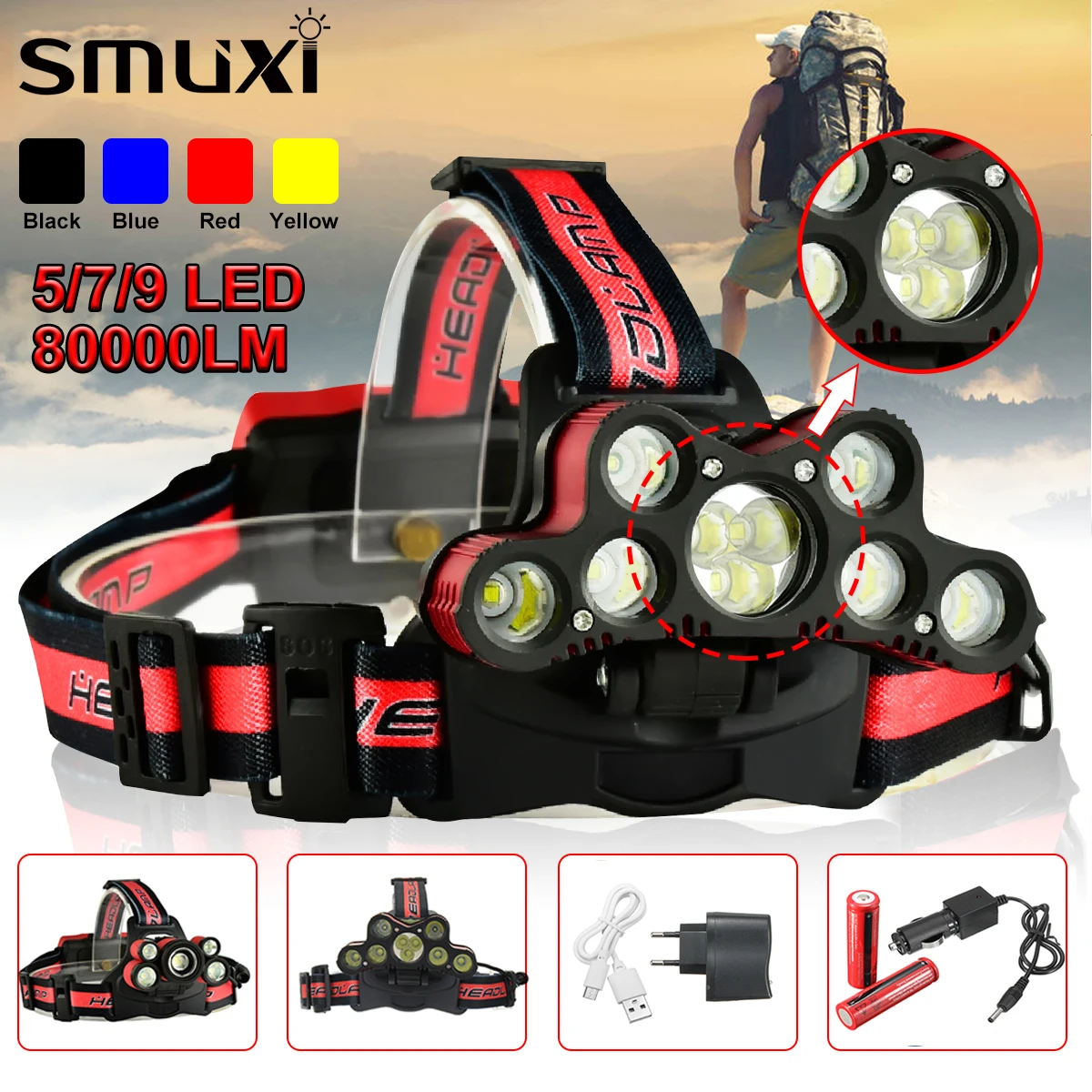 Smuxi светодиодный налобный фонарь 80000LM 5/7/9 светодиодный T6 фар головного фонарик Фонарь лба USB Перезаряжаемые фара Рыбалка фары