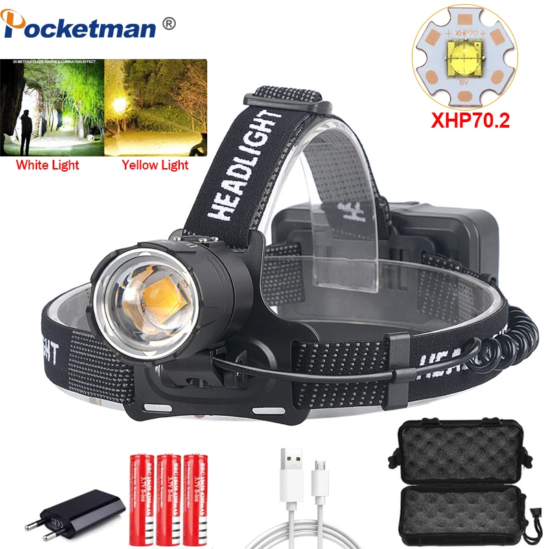 7000лм XHP70.2 светодиодный налобный фонарь XHP70 самый мощный желтый или белый светодиодный налобный фонарь для рыбалки, кемпинга, фонарь с зумом, 3*18650 батареи