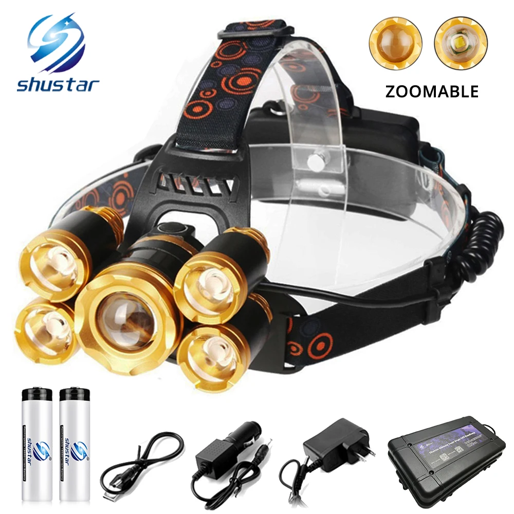 Супер яркий светодиодный налобный фонарь 5 x T6 светодиодный лампы шарик 15000 люмен светодиодный фар Масштабируемые рыбалка лампы Отдых на при...