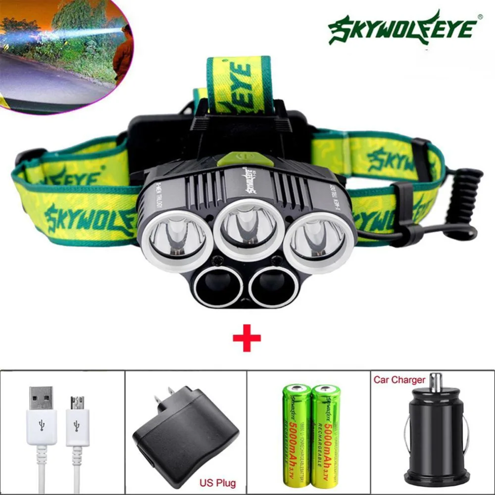 SKYWOLFEYE 80000 лм T6 5X светодиодный фар Перезаряжаемые Охота Рыбалка с USB кабель + автомобиля/AC Зарядное устройство + 2*18650 Батарея