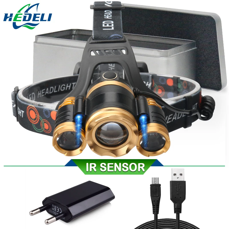 20000 люмен 3 T6 ИК Сенсор светодиодные фары Перезаряжаемый Фонарь налобный фонарик cree xml t6 Водонепроницаемый лобовой фонарь фар 18650