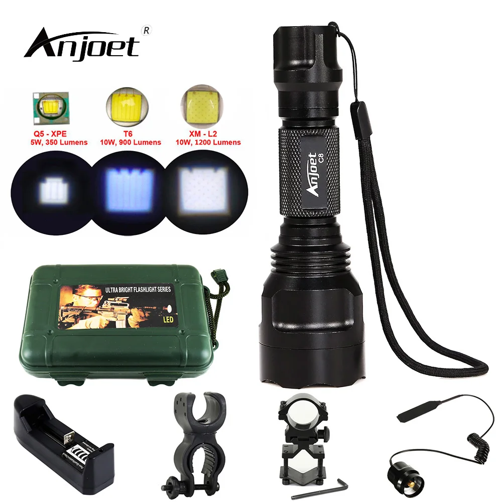 Anjoet C8 Охота фонарик светодио дный 1200LM XML T6 Q5 L2 Алюминий самообороны тактика горелки лампы Kit + Зарядное устройство + коробка + крепление