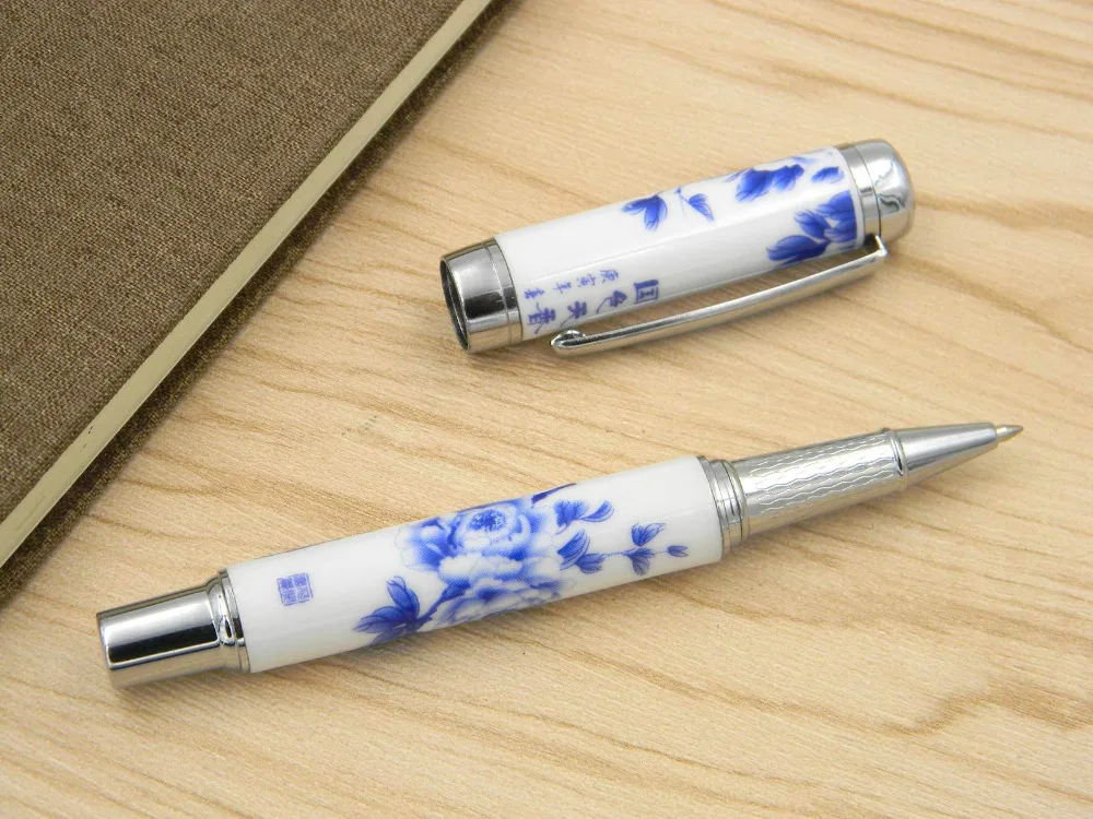 Керамика синий и белый фарфор китайская живопись Пион цветок серебряной отделкой Ручка роллер