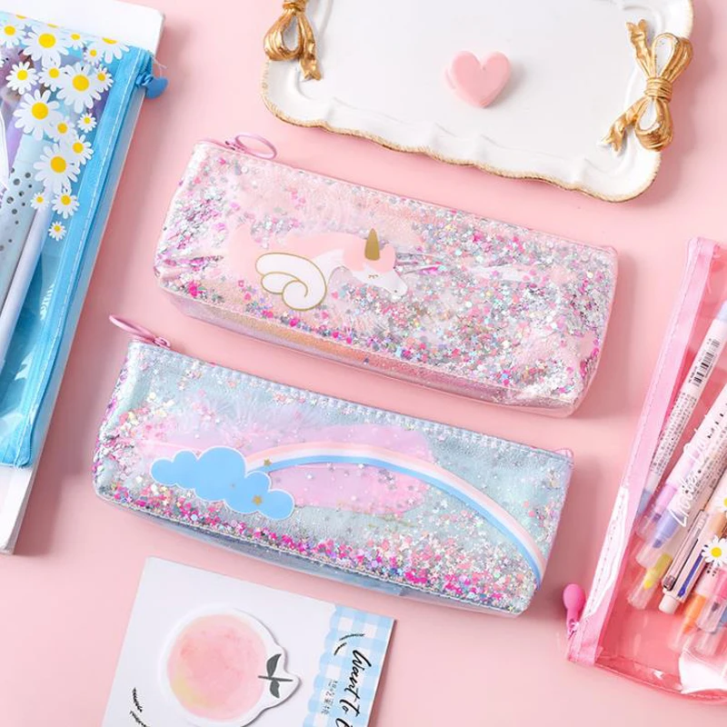 1 шт. Kawaii Радуга Единорог цветы Пенал Блестящие Блестки ПУ пенал школьные пеналы коробка сумка подарок канцелярские принадлежности