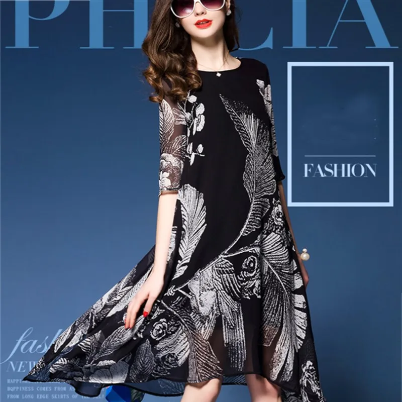 Весенне-летнее платье размера плюс женское платье из имитированного шелка с принтом женское модное свободное платье средней длины M-3XL